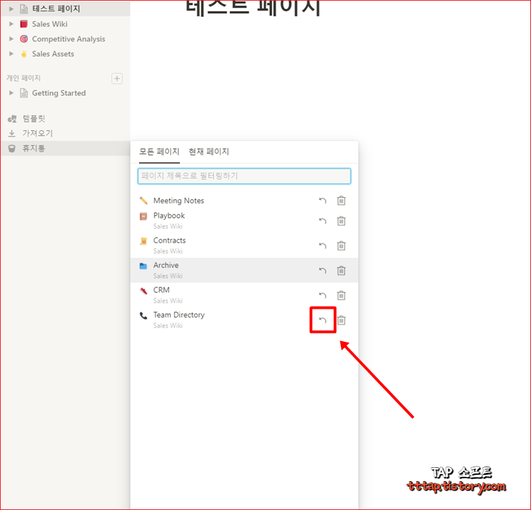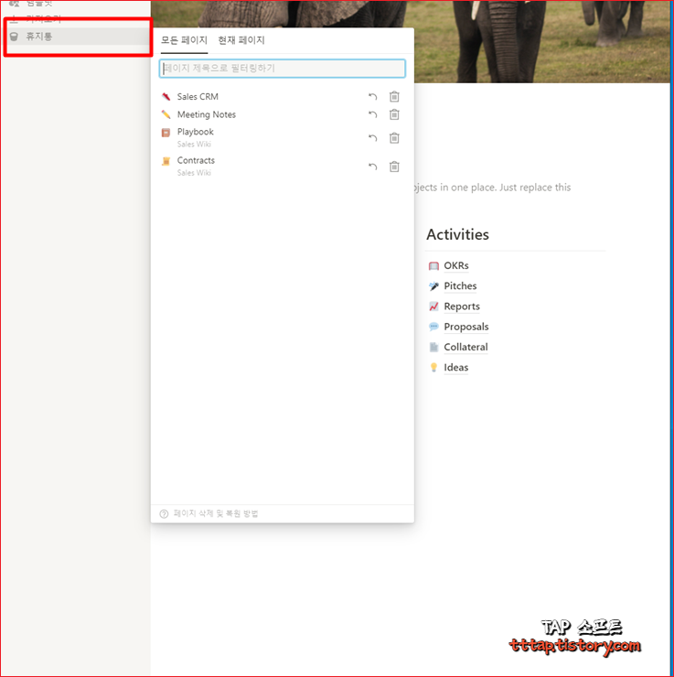 ▼ 4. 좌측 사이드 메뉴에서 가장 아래에 있는 휴지통 메뉴를 선택하면 지금까지 삭제한 모든 문서를 볼 수 있습니다. 만약 현재 페이지의 아이템만 보고 싶다면 상단의 현재 페이지를 누르면 현제 데이터베이스 또는 문서의 파일만 확인 할 수 있습니다.