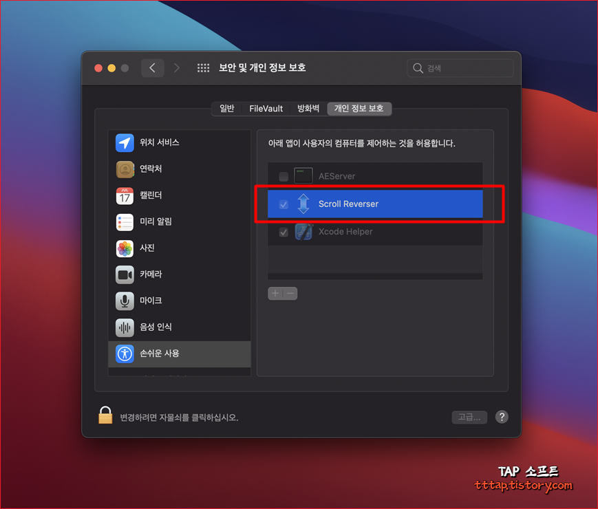 ▼ 1. 설치후에 보안 및 개인 정보 보호에서 권한을 설정해줍니다.