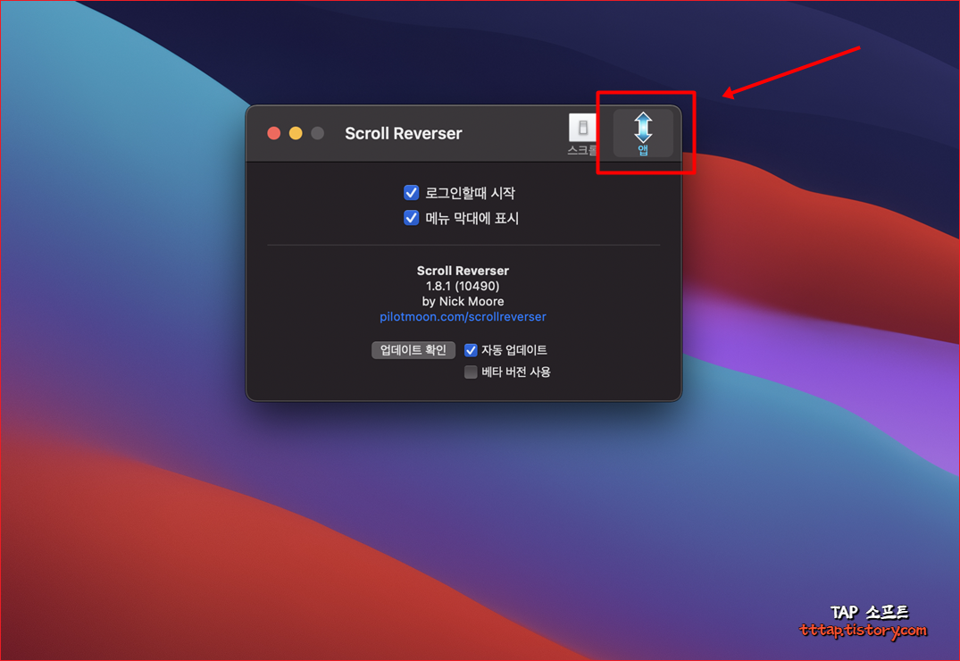그래서 발견한 프로그램이 SCROLL REVERSER이라는 프로그램입니다. 최신 맥 OS를 지원하며 사용법이 아주 쉽습니다.