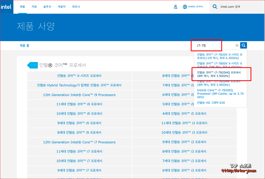 ▼ 4. 우측 상단에 검색필드에 i7-7820HQ를 검색해서 찾습니다. 그리고 눌러줍니다.
