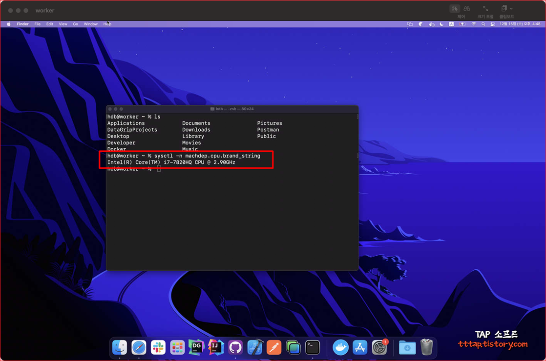 ▼ 2. 먼저 터미널(Terminal) 프로그램을 실행하고 다음과 같은 명령어를 통해서 해당 CPU 모델명을 볼 수 있습니다.