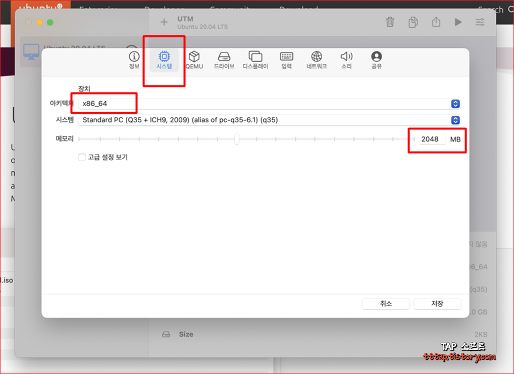 ▼ 4. 시스템을 설정합니다. 맥북에 따라서 아키텍처를 선택해주시고 램은 적당하게 기입합니다. 저는 맥북 15인치 16램 기기라서 2048 (2G) 로 설정해주었습니다. 나중에 필요에 따라서 조절이 가능합니다.