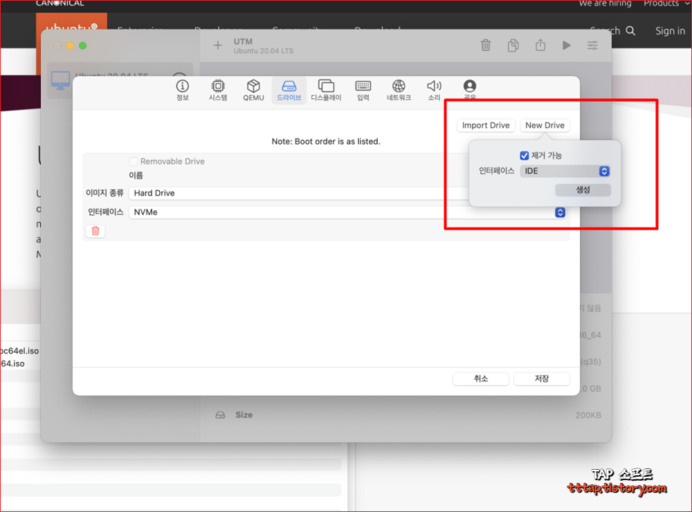 ▼ 7. 드라이브를 더 추가해줍니다. 이건 ISO 파일을 인식하기 위한 드라이브입니다. 인터페이스는 USB로 설정해줍니다 (스크린 샷은 잘못 찍었네요. IDE 아님) 이제 저장을 눌러서 팝업 창을 닫습니다.