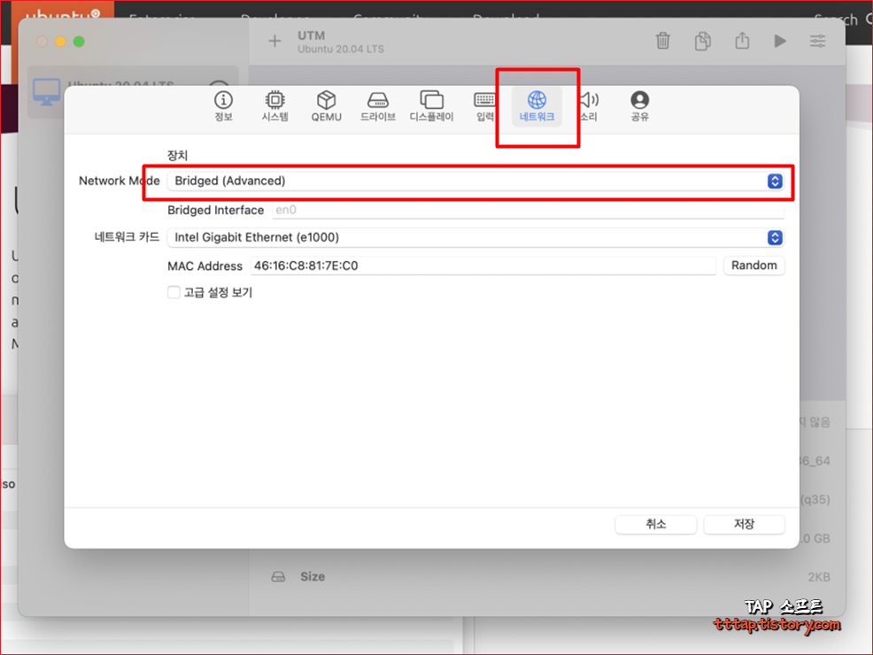 ▼ 5. 네트워크를 설정해줍니다. Bridged 로 설정해줍니다.