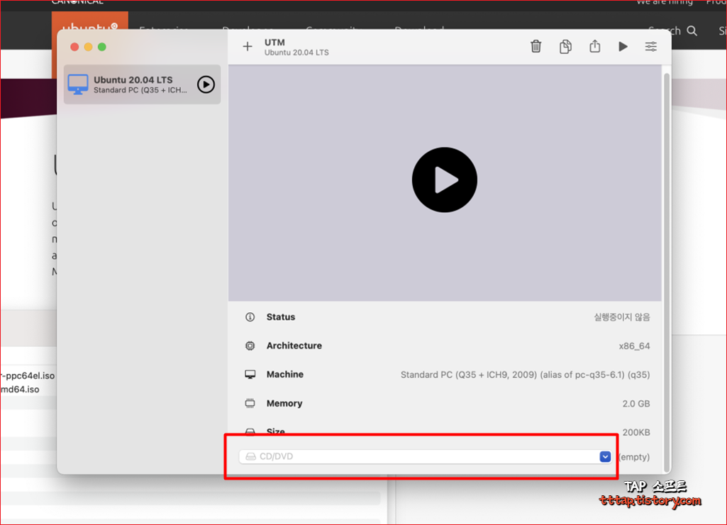 ▼ 8. 이제 본격적으로 설치해 보겠습니다. 하단에 아까전에 드라이브를 추가할 때 추가했던 USB 형태의 인터페이스를 보실 수 있습니다. empty로 비어 있는데요. 드롭다운 메뉴를 눌러서 우분투 설치 파일을 선택해줍니다. 그리고 시작 버튼을 눌러서 설치를 진행합니다.