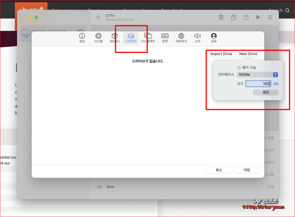 ▼ 6. 드라이브를 NVMe 로 설정해줍니다. 저는 500기가에서 100기만 할당해주었습니다. 사실 너무 큰데 잘 안쓰는 맥이라서 그냥 이렇게 설정했습니다. 대략 20기가만 되도 충분할 것 같네요.