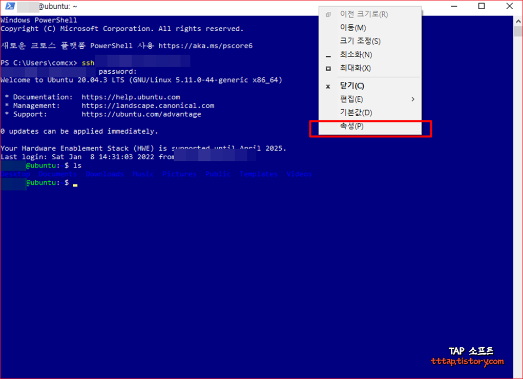 파워쉘 상단 바를 마우스 오른쪽 버튼으로 클릭합니다. 그리고 속성을 선택합니다.