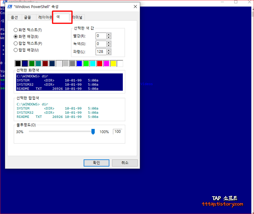 ▼ 파워셸 속성 창이 뜨면 다음과 같이 ‘색’ 탭을 선택합니다. 그러면 스크린 샷에서 볼 수 있듯이 백그라운드 색상, 텍스트 색상 및 팝업 텍스트 색상도 바꿀 수 있습니다. 하단에 보면 투명도를 지정할 수도 있는 메뉴를 볼 수 있습니다. 현재는 100%로 되어 있습니다.