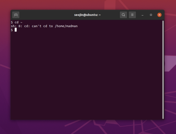 ▼ 이제 새로운 사용자로 로그인해서 cd ~ 명령을 해주면 홈디렉토리로 이동하는데 다음과 같은 에러를 볼 수 있습니다. 사용자 홈디렉토리를 찾을 수 없기 때문이죠. 분명 /etc/passwd 파일에서는 홈디렉토리를 madman으로 정했는데 실제 폴더 위치가 존재하지 않기 때문입니다. 때문에 다음과 같이 홈디렉토리를 만드는 옵션과 함께 새로운 사용자를 추가해주면 됩니다.