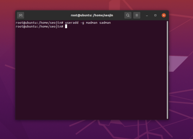 ▼ 그렇다면 그룹을 포함해주는 옵션을 뭘까요. 사실 사용자를 만드는 것은 단순히 사용자를 추가하는 일도 있겠지만 사실상 그룹을 만들어서 관리하기 위함이 큰데요. 보통 그룹 아이디(GID)는 사용자 아이디(UID)와 동일하게 생성됩니다. 다음과 같이 sadman 이라는 새로운 사용자를 한 번 더 만들어 보겠습니다. madman의 경우 최초에 사용자를 만들때 /etc/group 파일에 madman 이라는 그룹도 만들게 됩니다. 그래서 두 번째 사용자를 첫 번째 사용자의 그룹에 속하도록 옵션을 주었습니다.