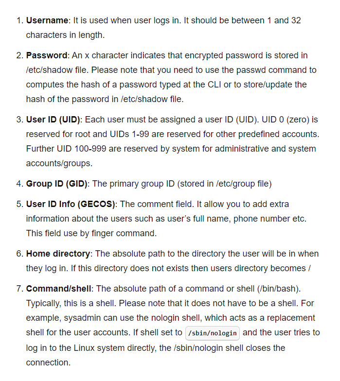 - Password 비밀번호 : x는 암호화 되었다는 의미이며, 해당 비밀번호는 /etc/shadow 파일에 저장됩니다.