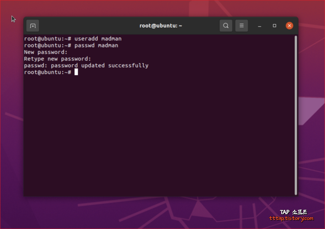 ▼ 사용자를 추가 했다면 passwd 명령으로 새로운 사용자의 비밀번호를 변경해줍니다.