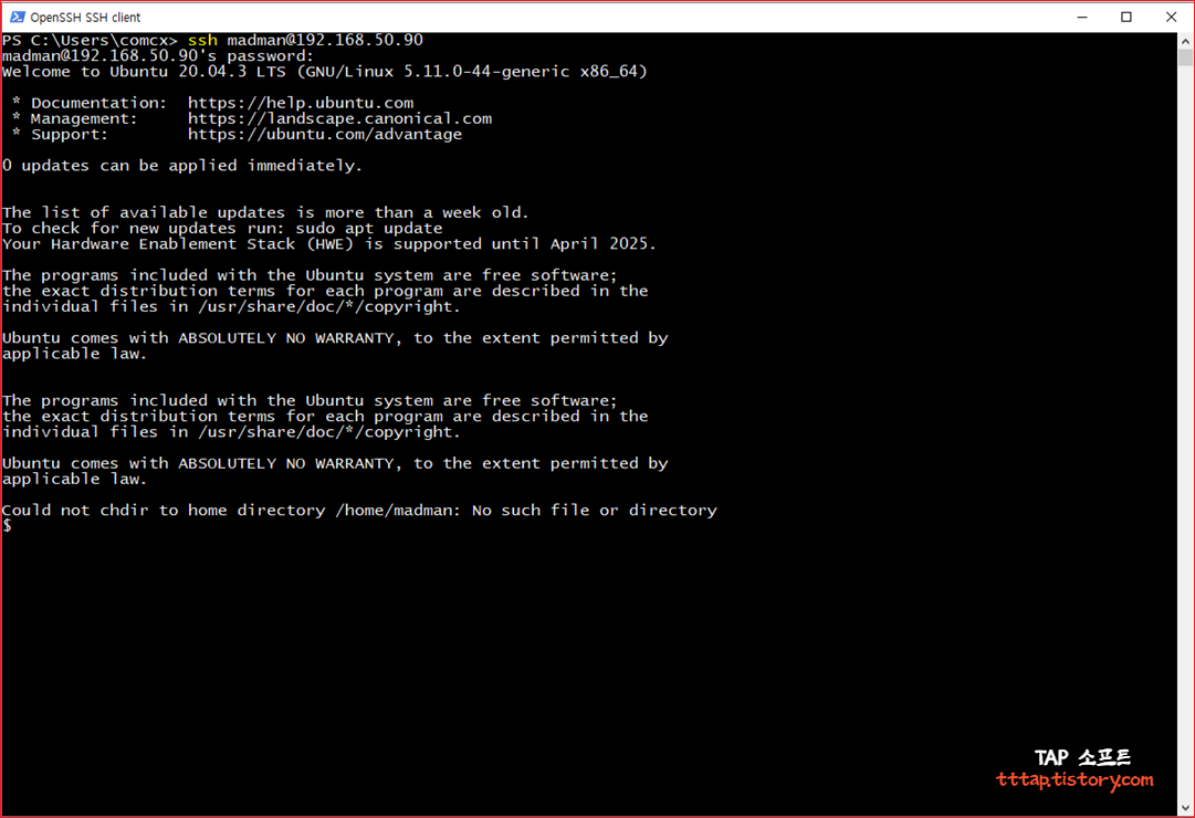 ▼ 마지막으로 ssh로 새로운 사용자로 로그인 테스트 해보겠습니다. 다음과 같이 입력해서 해당 컴퓨터로 접속이 가능합니다. 물론 ssh 서버가 설치되어 있어야 합니다.