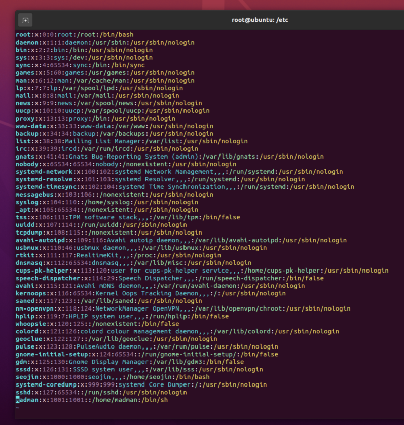 파일 내용을 보면 최상위에 표시된 root를 포함해서 상당히 많은 사용자를 볼 수 있습니다. 그중 조금 전에 추가한 madman이라는 사용자를 맨 아래에서 확인 하실 수 있습니다. 이처럼 새로운 사용자는 파일 최 하단에 기록됩니다.