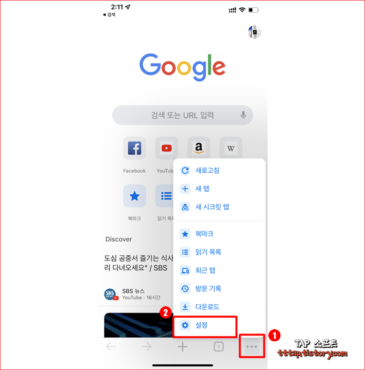 ▼ 1. 크롬 브라우저를 여시고 하단 툴바의 더보기 메뉴를 눌러서 메뉴 리스트를 노출시킵니다. 그리고 설정 메뉴를 선택합니다.