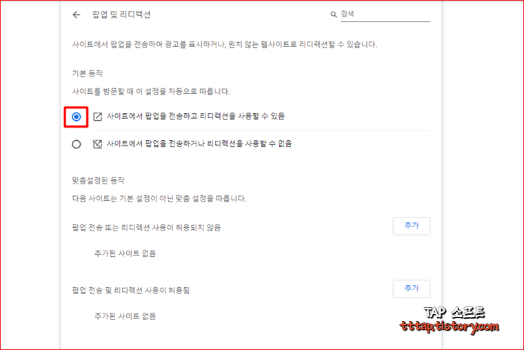 ▼ 4. 팝업 및 리디렉션 메뉴에서 "사이트에서 팝업을 전송하고 리디렉션을 사용할 수 있음" 라디오 버튼을 선택합니다. 그 아래의 "사이트에서 팝업을 전송하거나 리디렉션을 사용할 수 없음"을 선택하면 팝업이 제한됩니다.