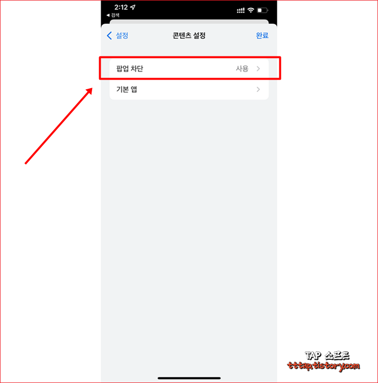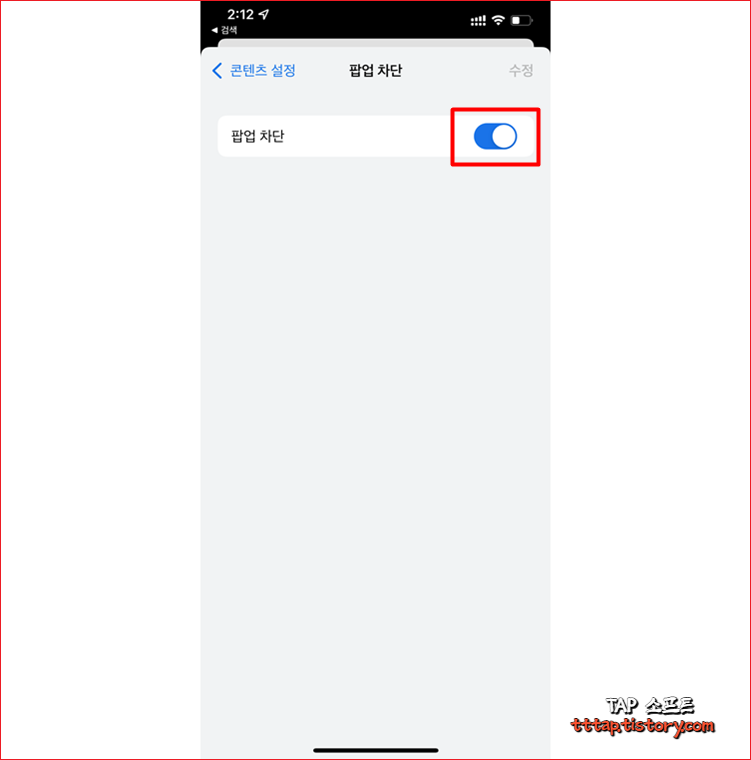 ▼ 4. 팝업 차단 메뉴에서 팝업 차단 스위치를 꺼줍니다. 기본 값은 On 이며 스위치를 터치해서 Off로 변경합니다.