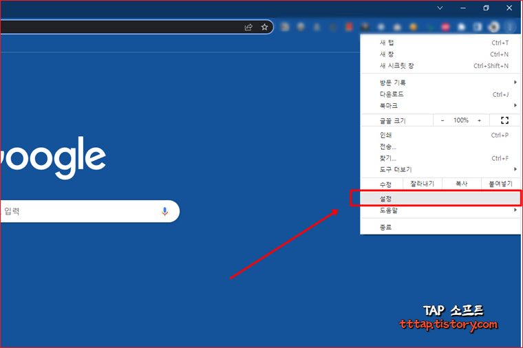 이제는 윈도우용 구글 크롬 브라우저에서 팝업 차단을 해제해보겠습니다. 맥이나 리눅스에서도 설정에서 팝업을 허용하는 방법은 비슷합니다.