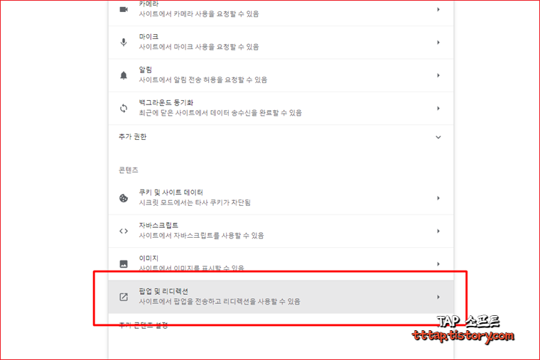 ▼ 3. 사이트 설정 메뉴에서 하단으로 스크롤 하다보면 팝업 및 리디렉션 메뉴가 있습니다. 클릭해서 진입합니다.