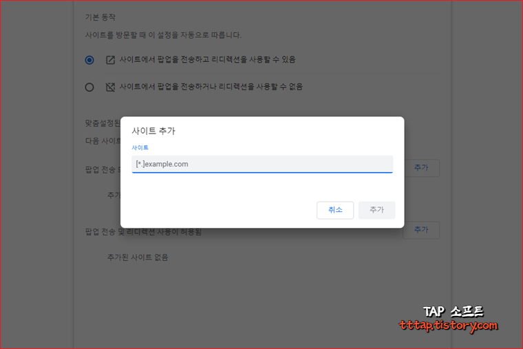 ▼ 5. 만약 특정 사이트만 허용하고 싶다면 다음과 같이 사이트 추가를 통해서 특정 사이트만 팝업 차단을 해제할 수 있습니다.