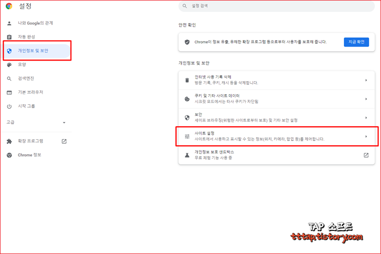▼ 2. 좌측 탭 메뉴에 개인정보 및 보안 탭을 누르고 사이트 설정 메뉴로 진입합니다. 사이트 설정 메뉴는 사이트에서 사용하고 표시할 수 있는 정보(위치, 카메라, 팝업 등)를 제어합니다.