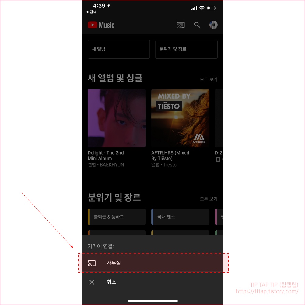 ▼ 1. YT 뮤직에 앱에 들어갑니다. 상단에 크롬캐스트 버튼을 누릅니다.