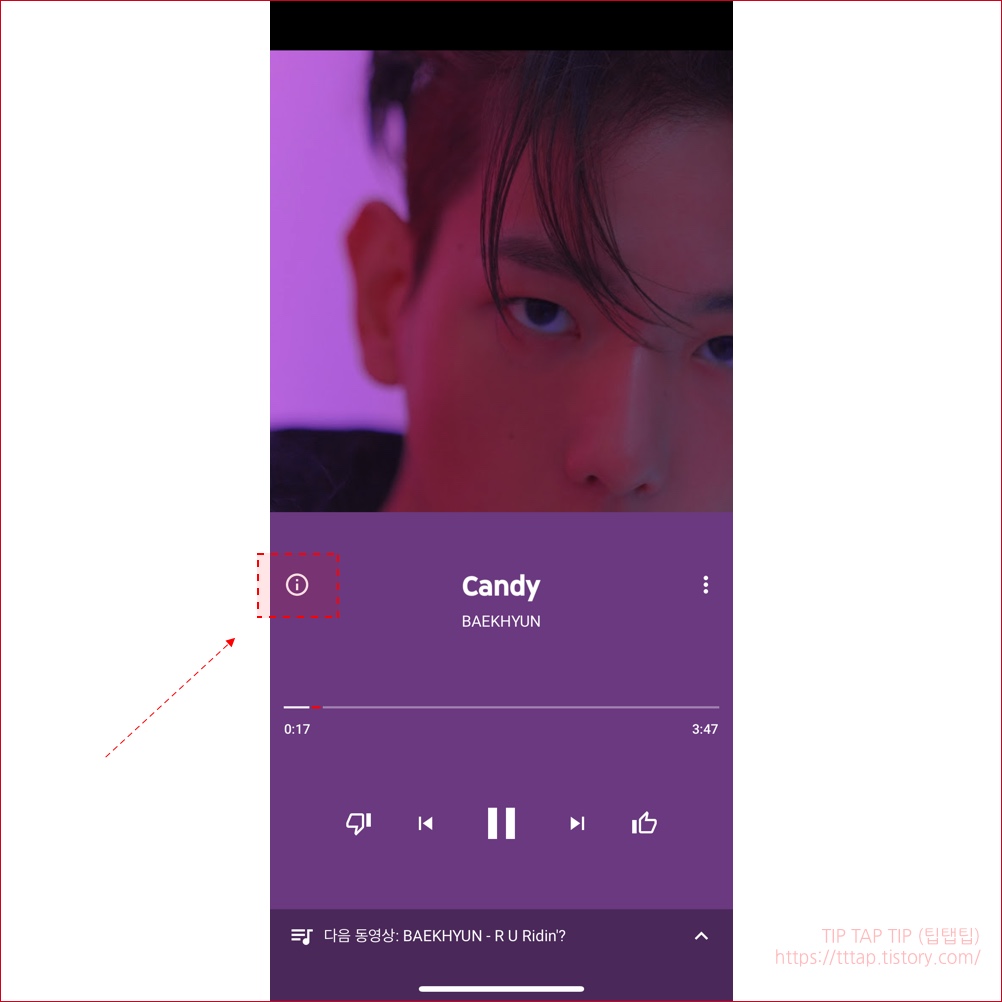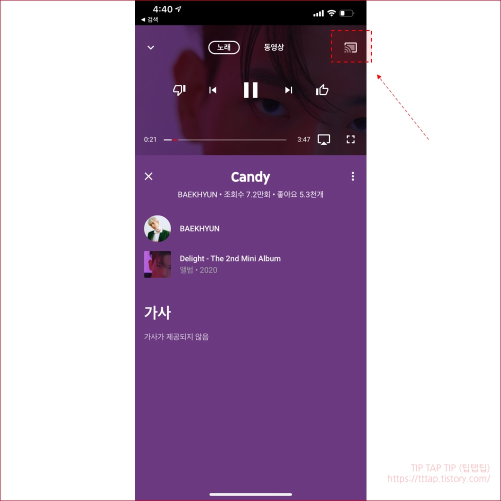 ▼ 5. 마지막으로 음악을 재생중에 연결하는 법을 알아보겠습니다. 음악 재생 중에는 상단에 크롬캐스트 버튼이 없을 수 있는데요. 이때 i 정보 아이콘을 누르면 상단에 버튼이 노출됩니다.
