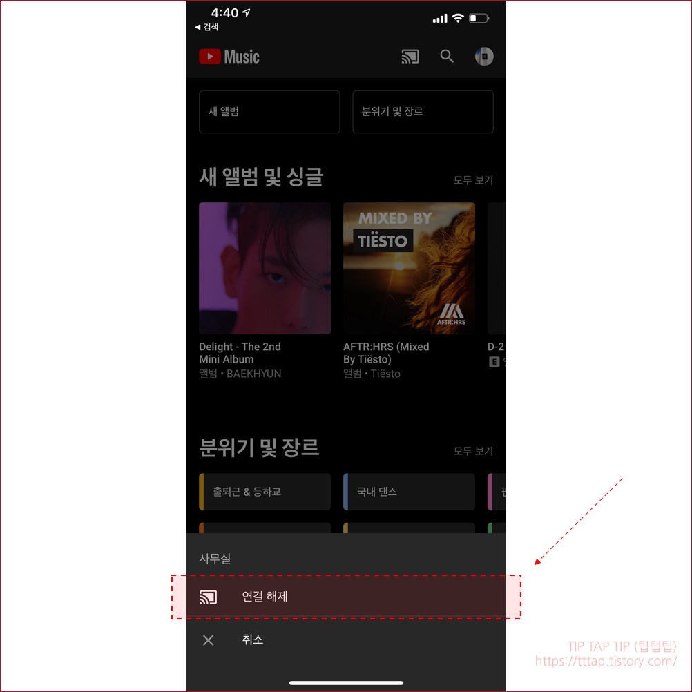 ▼ 4. 크롬캐스트 버튼을 누르면 하단에 연결 해제 버튼이 생기는 것을 보실 수 있습니다. 이렇게 해제도 가능합니다.