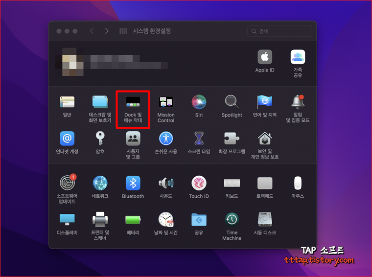 ▼ 2. 맥 시스템 환경설정에 들어가서 Dock 및 메뉴 막대를 선택합니다.