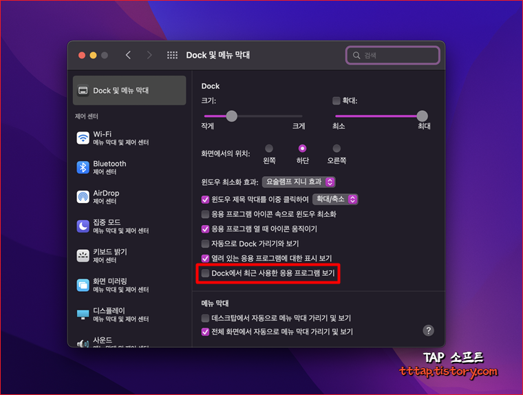 ▼ 3. Dock 및 메뉴 막대에서 Dock에서 최근 사용한 응용프로그램 보기 부분을 체크 해제해줍니다.