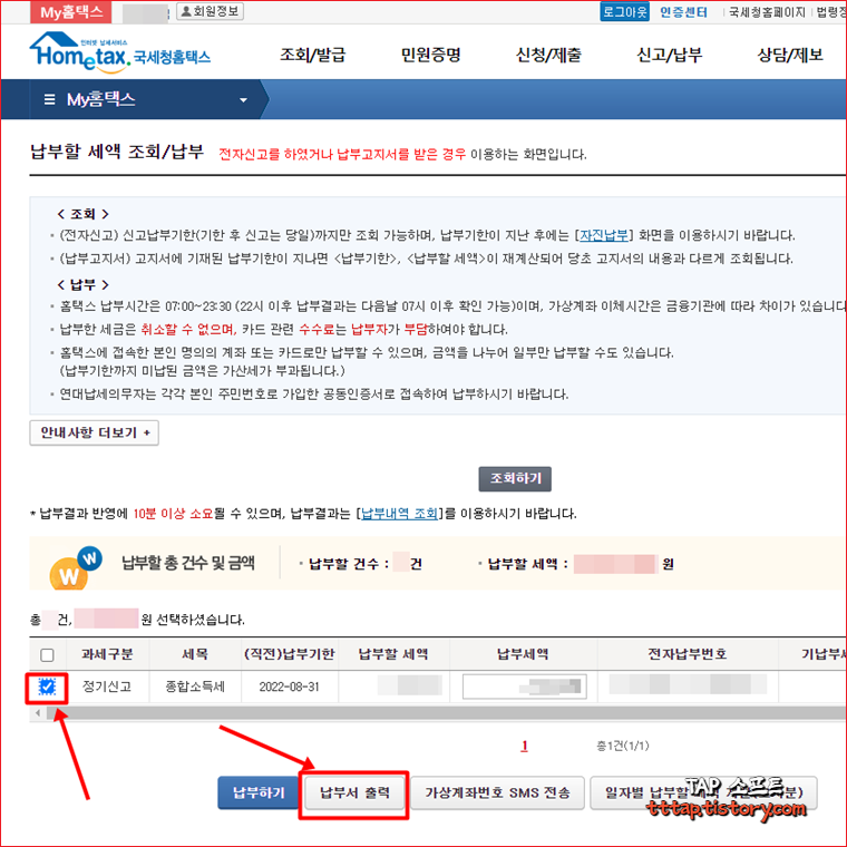 [ 홈택스 ] 종합소득세 납부서 출력 (납부내역서)