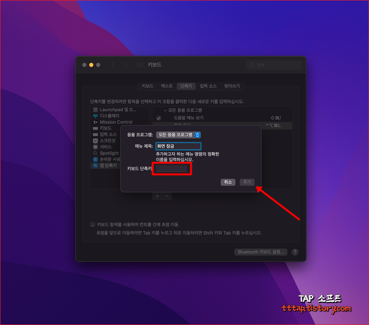 ▼ 1. 이제 추가할 단축키 설정 팝업이 노출됩니다. 메뉴 제목을 꼭 '화면 잠금'으로 입력하시고 키보드 단축키에 원하는 키를 입력합니다. 윈도우 처럼 단축키를 적용하려면 CMD+L 키로 적용하면 좋겠지만 모든 응용 프로그램인 경우 모든 상황에서 동작하니 가급적 잘 사용하지 않는 단축키를 사용하는게 좋을 겁니다. 저 같은 경우는 CMD+ALT+CTRL+L 키로 정했습니다.