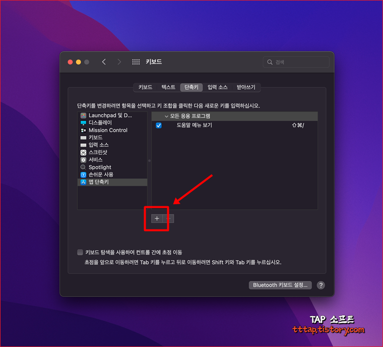 ▼ 2. 키보드 메뉴에서 단축키 탭으로 이동합니다. 좌측 메뉴에서 앱 단축키를 선택합니다. 그리고 + 버튼을 눌러줍니다.