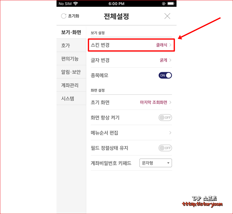 ▼ 4. 전체 설정 메뉴에서 보기/화면 탭 메뉴 > 보기 설정에서 스킨 변경 버튼을 눌러줍니다.