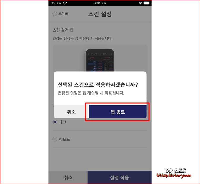 ▼ 6. 선택된 스킨으로 적용하시겠습니까? 라는 팝업이 뜨면 앱 종료 버튼을 눌러서 앱을 새로 시작해줍니다.