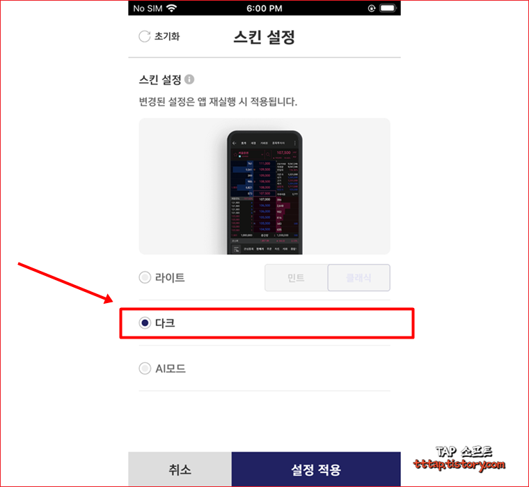 ▼ 5. 스킨 설정에서 다크 모드를 선택합니다. 라이트 모드도 민트, 클래식 메뉴가 있습니다. AI 모드는 시간대별로 색상을 변경해주는 기능입니다. 또한 기존의 설정을 유지하고 싶다면 좌측 상단에 초기화 버튼을 눌러줍니다.