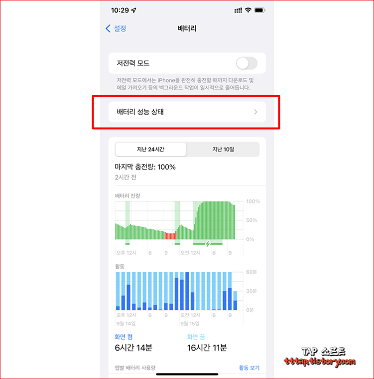 ▼ 3. 배터리 설정 메뉴에서 저전력 모드 아래 부분에 배터리 성능 상태 메뉴를 확인할 수 있습니다. 배터리 성능 상태 메뉴를 누르고 진입합니다.