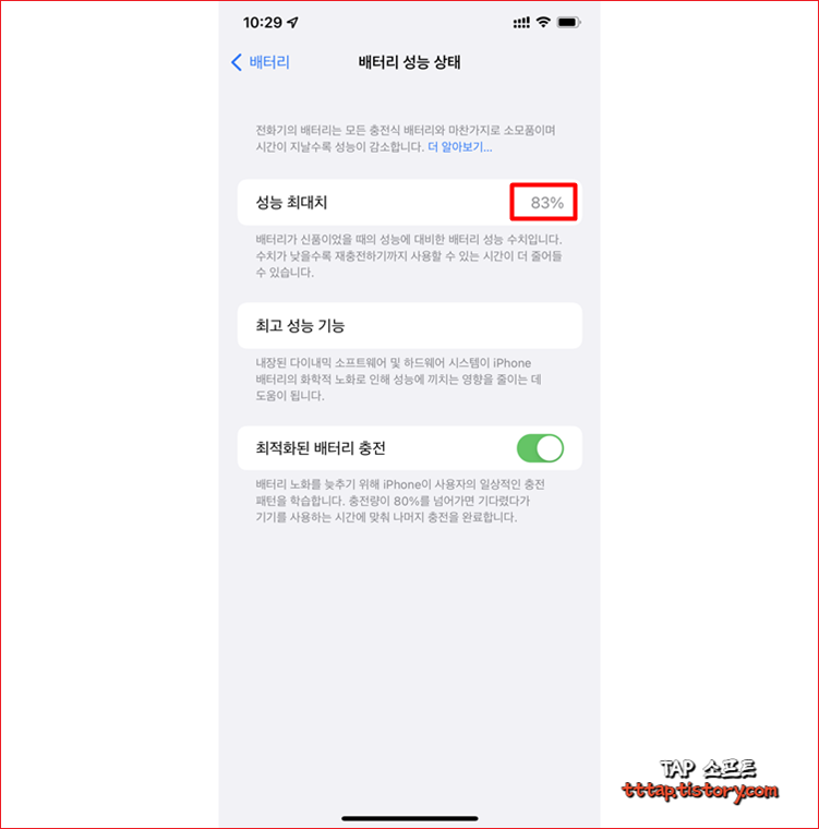 [ 아이폰 ] 배터리 성능 최대치 충전량 확인