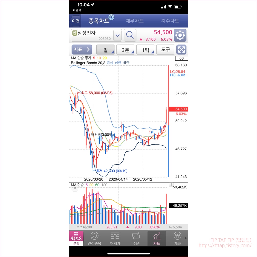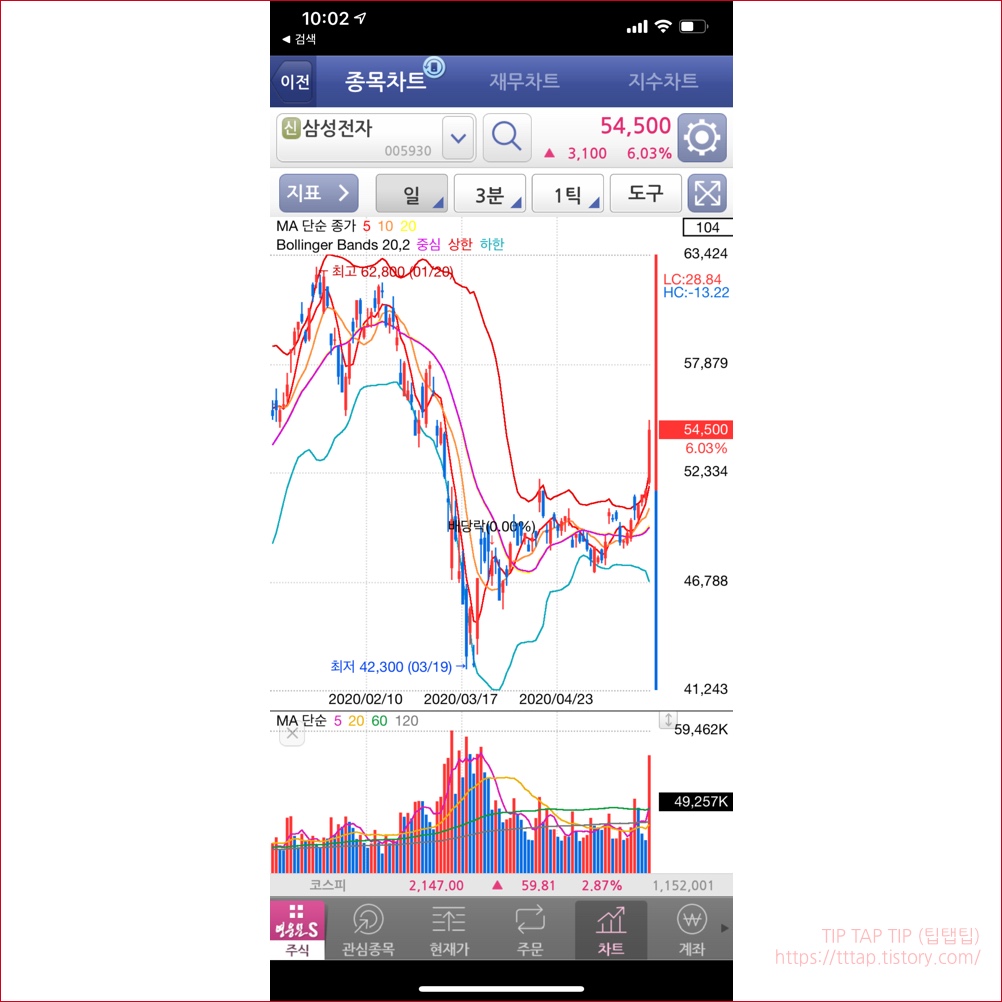1980년대 존 볼린저란 사람이 볼린저밴드란 지표를 개발했습니다. 영웅문 S 프로그램에서도 이 지표를 지원합니다. 기본적으로는 거래량 지표와 이동평균선정도가 노출되어 있는데요. 새로 지표를 볼린저밴드 지표를 추가해서 영웅문 S 모바일앱에서 사용해보겠습니다.