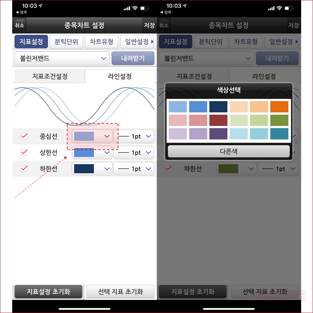 ▼ 6. 라인설정 메뉴로 이동해서 중심선 상한선 하한선 색상을 변경합니다. 색상도 변경이 가능하고 선 굵기도 조절이 가능하네요. 체크 박스를 제거하면 해당 라인을 가릴 수도 있습니다.