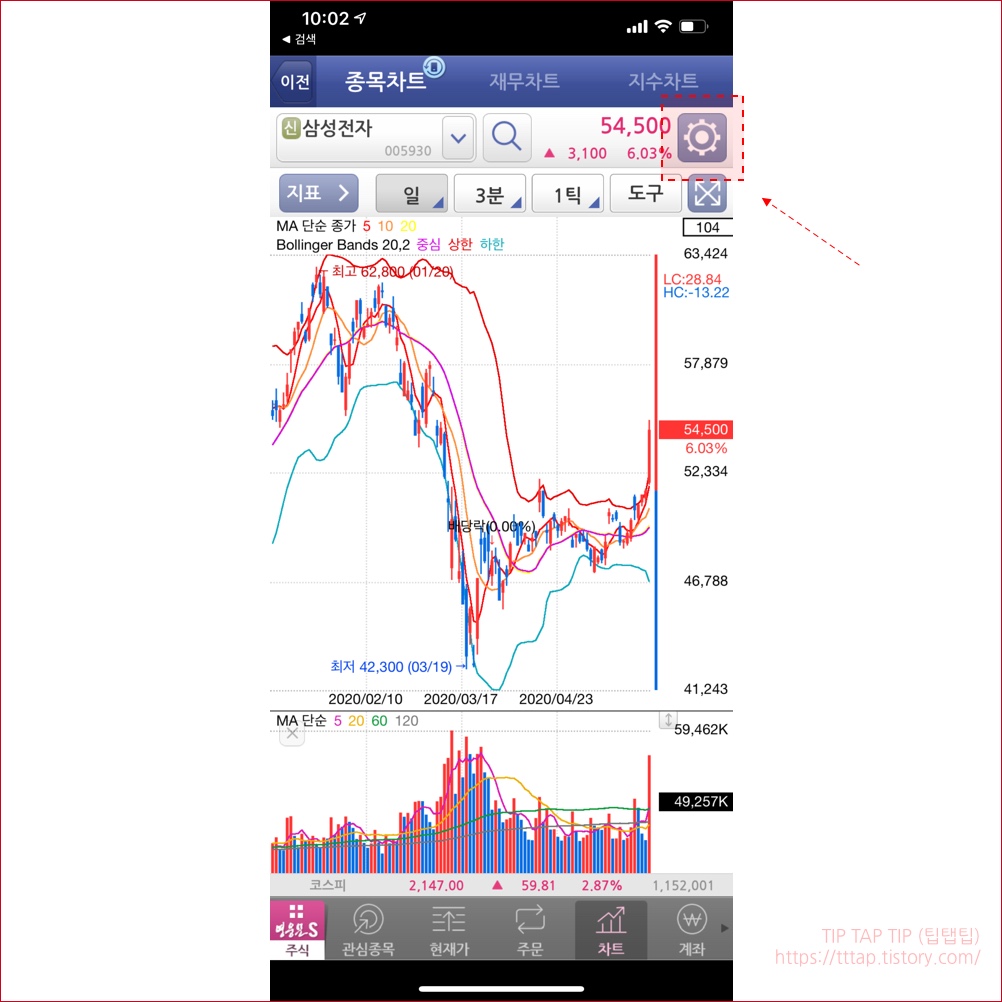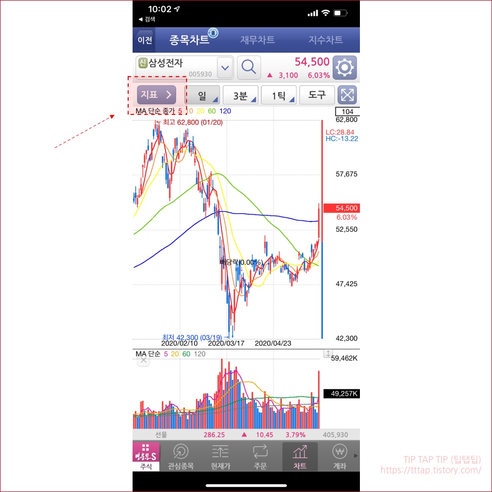 ▼ 1. 차트 화면에서 지표 버튼을 선택합니다.