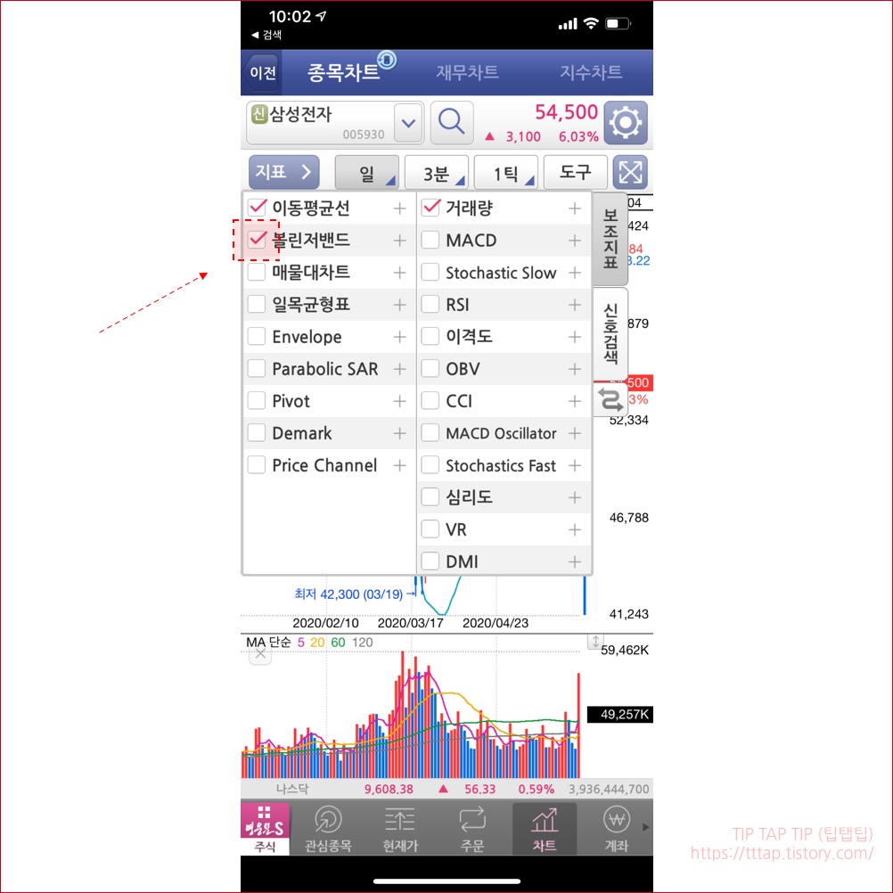 ▼ 2. 보조지표탭에서 볼린저밴드 지표를 선택합니다.