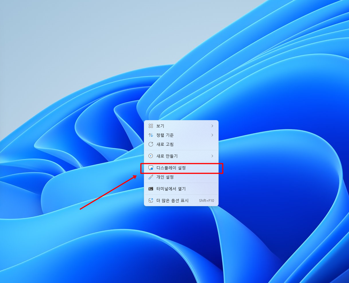 ▼ 1. 우선 바탕화면에서 마우스 오른쪽 버튼을 눌러 더보기 메뉴를 열어줍니다. 그리고 디스플레이 설정 메뉴를 눌러줍니다.