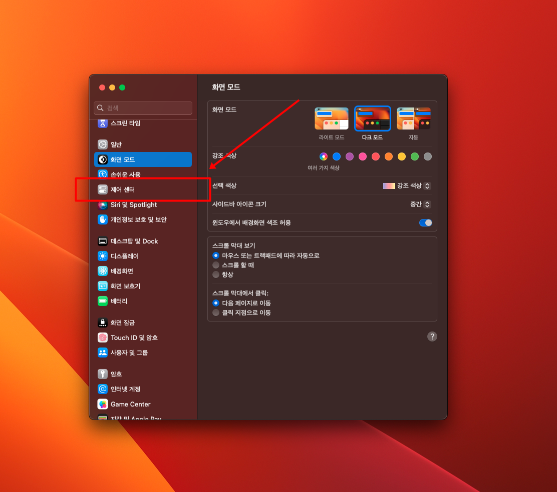 ▼ 2. 다음으로 시스템 설정 메뉴에서 스크롤 하다보면 제어 센터 메뉴를 확인할 수 있습니다. 제어센터 메뉴를 선택합니다.