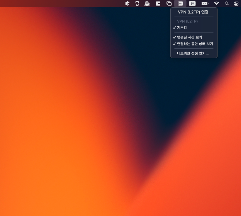 ▼ 4. 이제 메뉴 막대에서 VPN 연결 설정을 볼 수 있습니다. 추가적으로 연결된 시간을 보려면 체크 박스를 활성화 하고 연결하는 동안 상태를 보려면 이 역시 체크 박스를 활성화 해주면 됩니다. 저는 보통 두 옵션을 모두 활성화 합니다.
