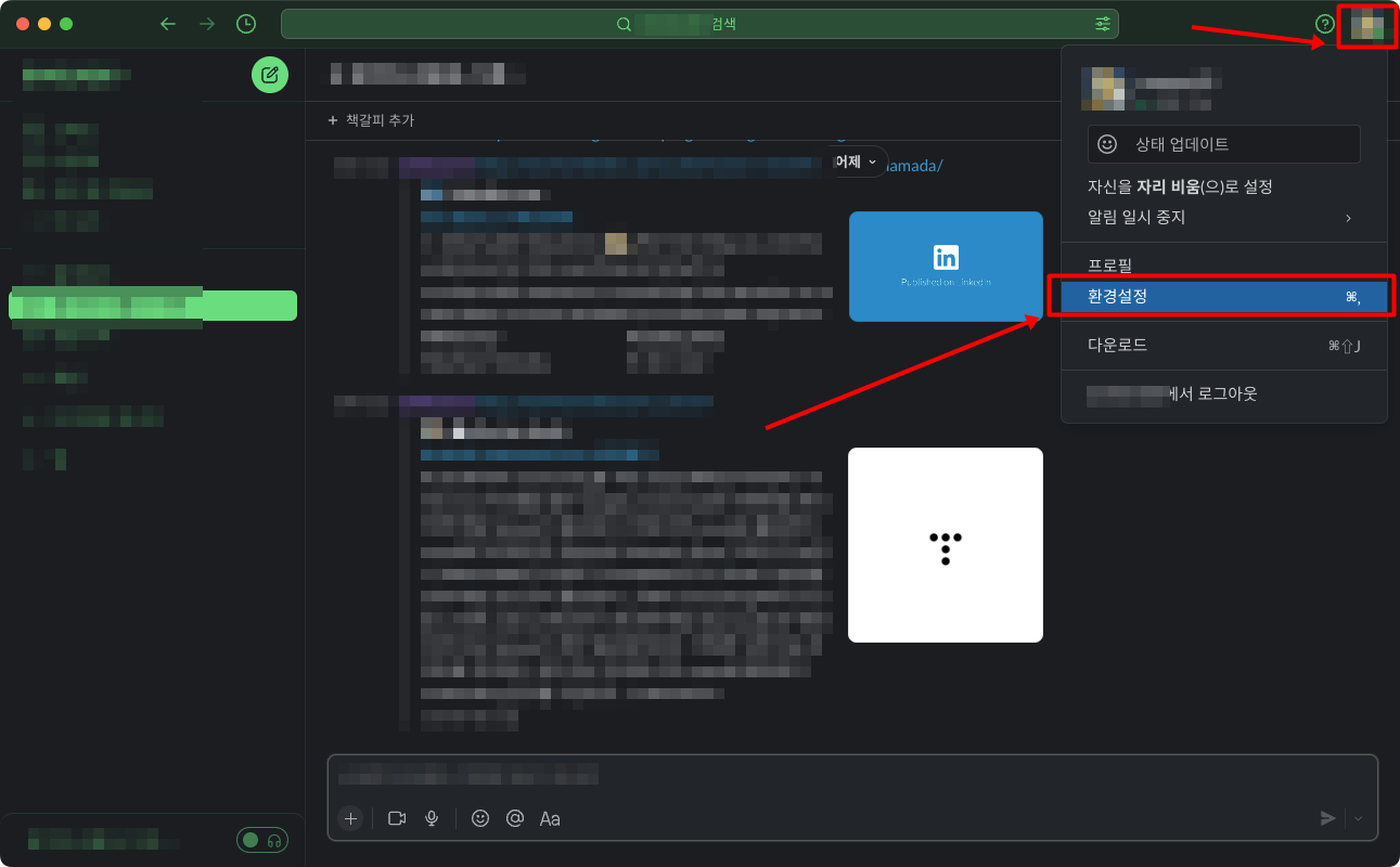 ▼ 1. 슬랙을 열고 우측 상단에 프로필 아이콘을 눌러 메뉴를 노출 시킵니다. 환경설정(Cmd + ,) 메뉴를 선택해서 환경 설정으로 들어갑니다.