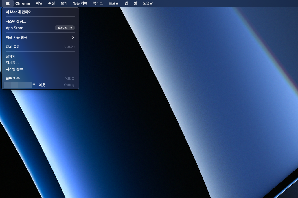 ▼ 1. 맥북 좌측 상단의 사과 모양의 아이콘을 누르고 시스템 설정 메뉴를 선택합니다.