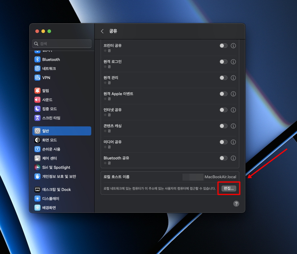 ▼ 3. 공유 메뉴에서 하단으로 끝까지 스크롤 하면 호스트 이름을 확인할 수 있습니다. "[사용자 호스트이름].local" 형태로 구성되어 있습니다. 편집 버튼을 눌러서 수정이 가능합니다.