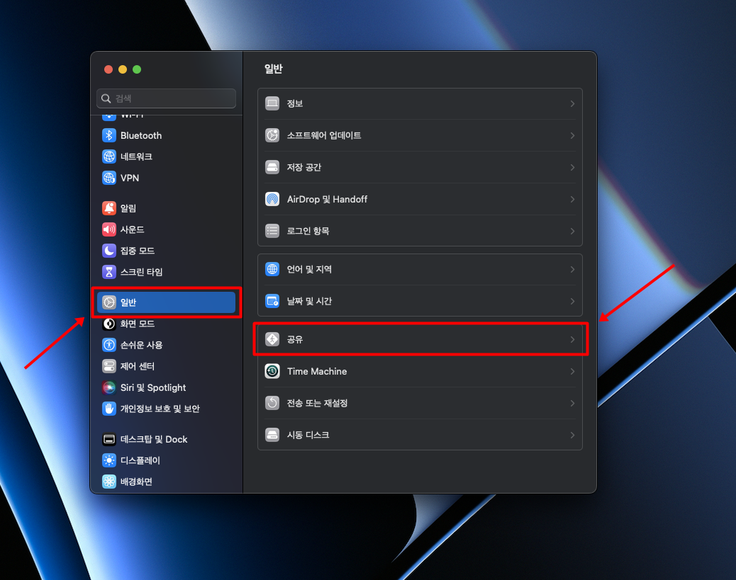 ▼ 2. 좌측 탭 메뉴 중에서 일반 메뉴를 누르고 다시 공유 메뉴를 눌러줍니다.