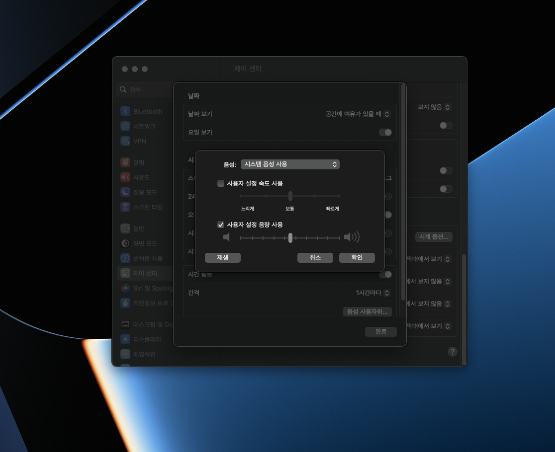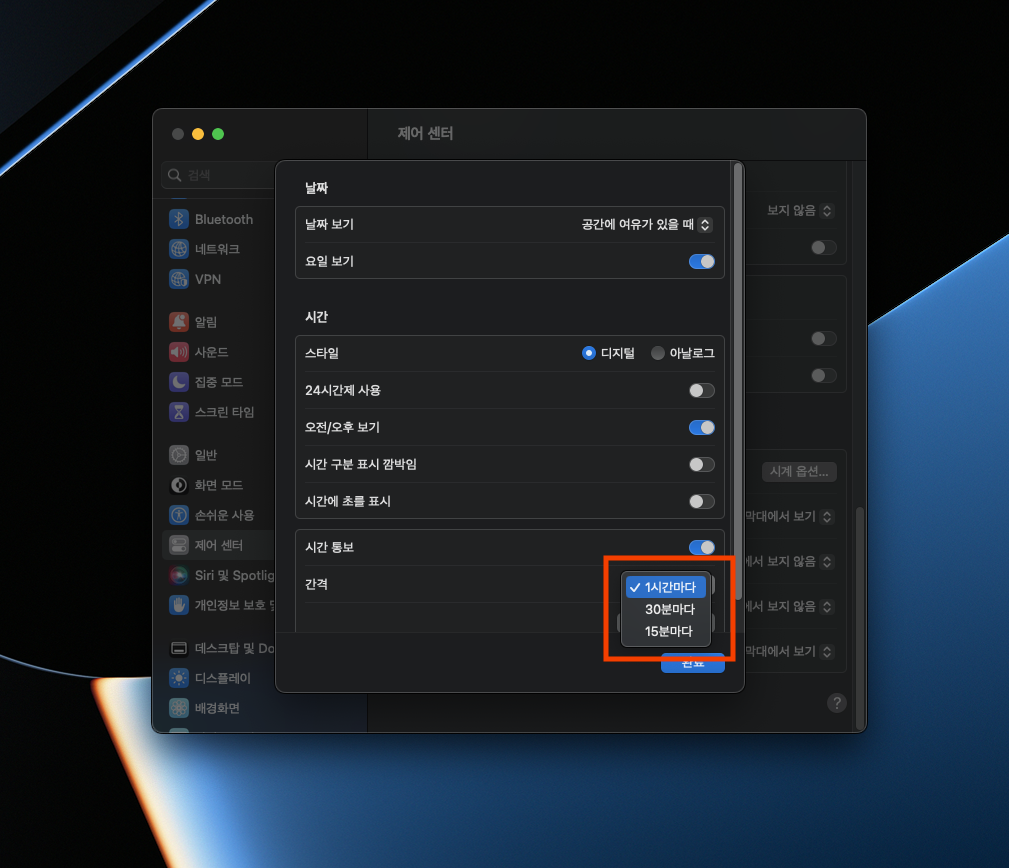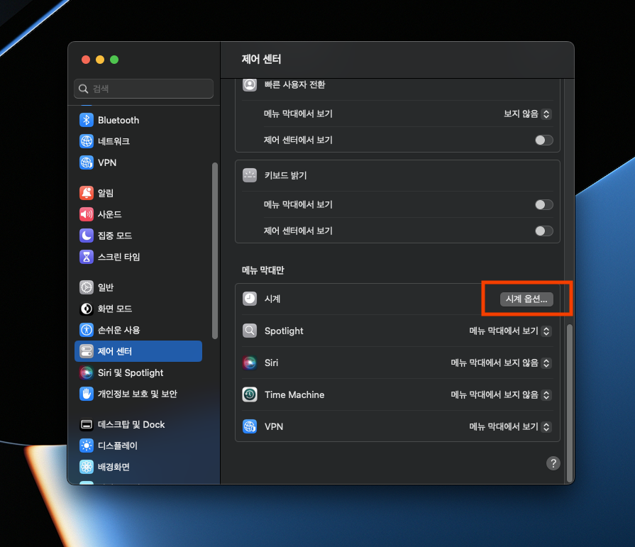 ▼ 1. 우선 맥 설정으로 들어가서 제어 센터를 열어줍니다. 제어센터 메뉴를 스크롤해서 내리면 시계 옵션... 이라는 버튼을 확인할 수 있습니다. 이 버튼을 클릭하면 시계 옵션을 설정할 수 있는 화면이 나옵니다.